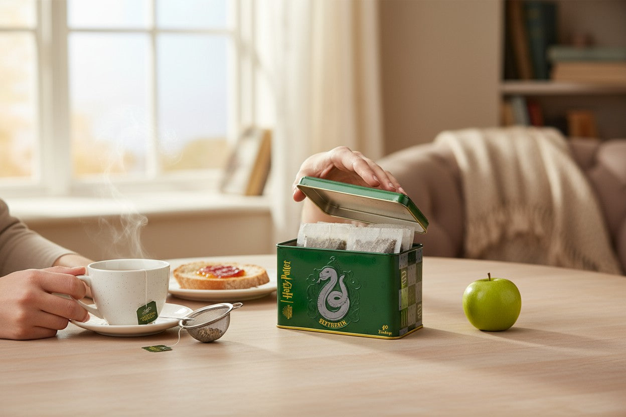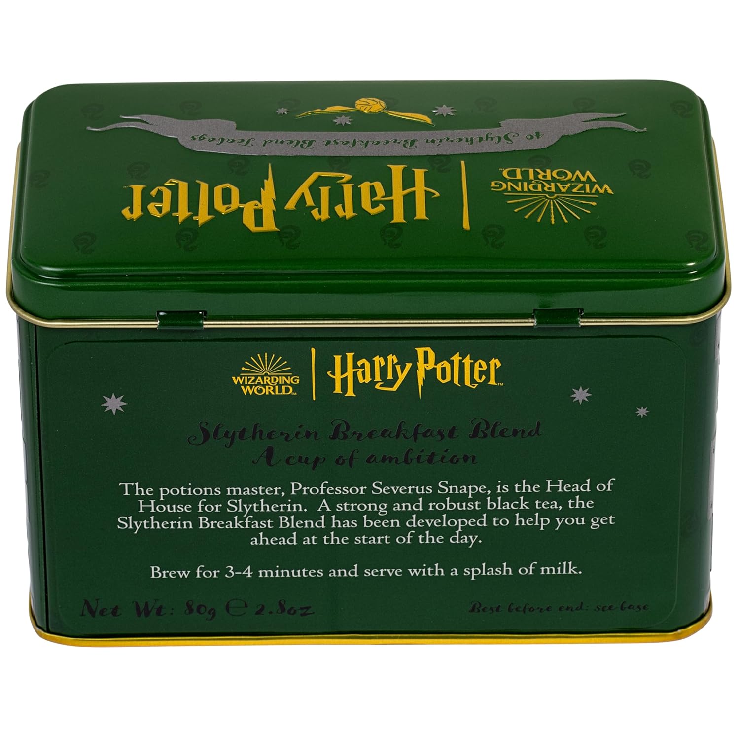 Despierta tu magia con esta lata de té coleccionable de Harry Potter inspirada en Slytherin 🐍. Incluye 40 bolsitas de té en una caja metálica premium.