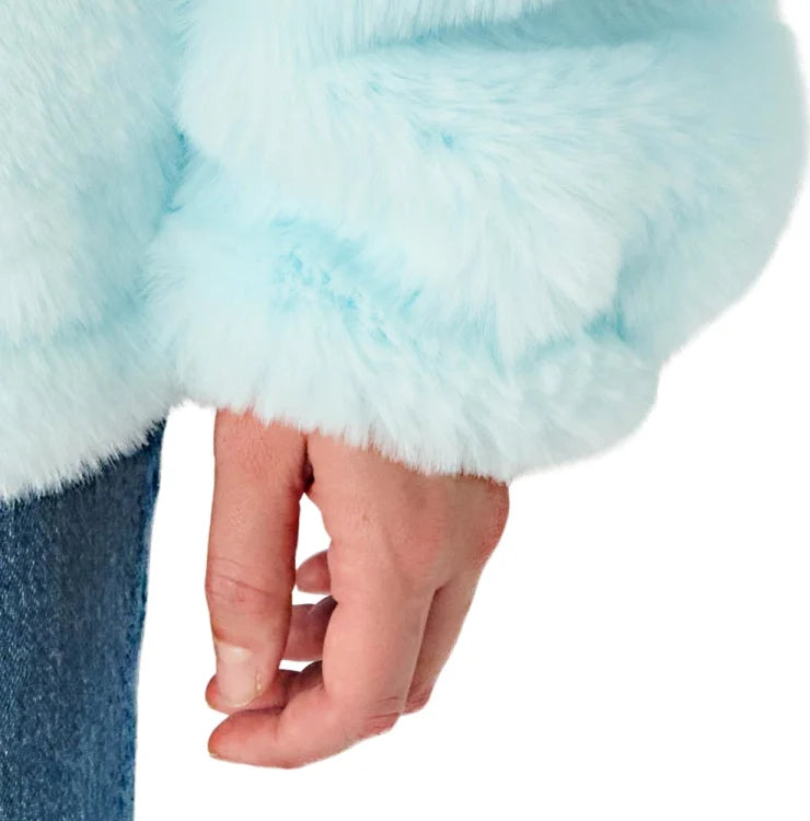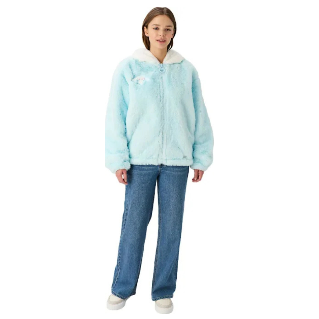 Confeccionada en suave peluche color azul cielo, esta chamarra cuenta con capucha con orejitas y rostro de Cinnamoroll bordado, además de un parche adorable del personaje en la manga. El interior es igual de suave y calentito, ideal para los días fríos o para completar un outfit encantador. ¡Perfecta para fans de Sanrio y amantes del estilo japonés cute!