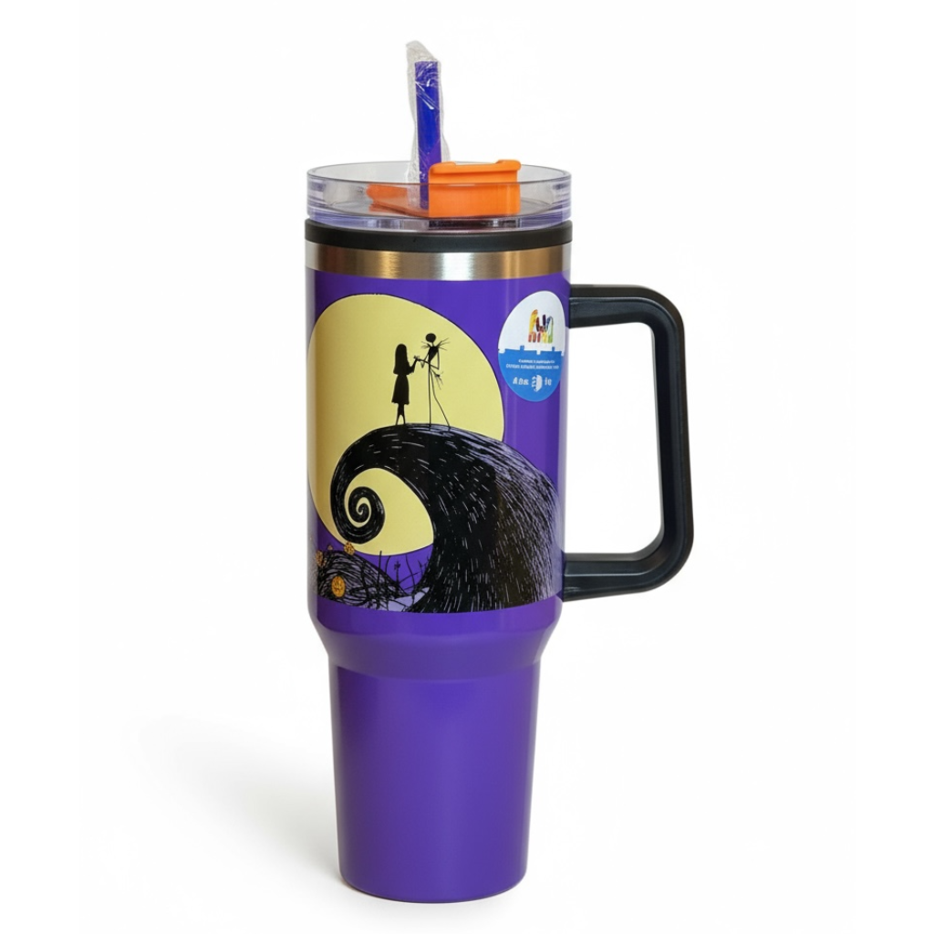 Lleva la magia oscura y encantadora de El Extraño Mundo de Jack contigo a donde vayas con este termo. Perfecto para fanáticos de Halloween, este termo presenta a Jack Skellington, Sally y Zero en un diseño vibrante en tonos morado y negro, con una escena clásica bajo la luna llena.